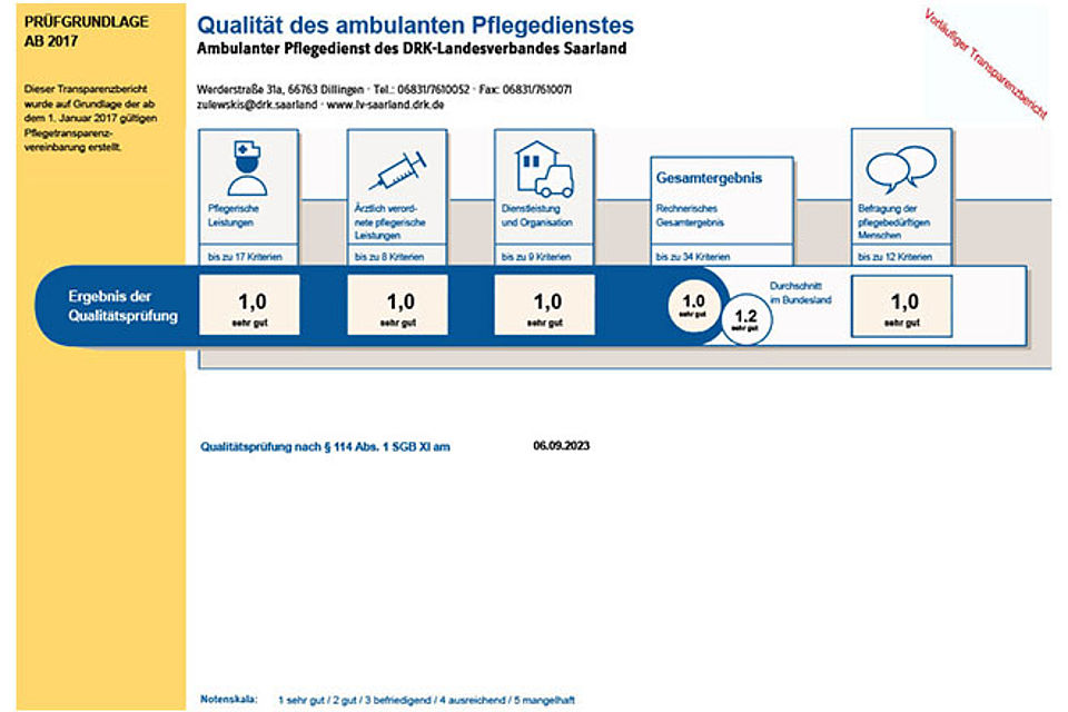 Unser Ambulanter Pflegedienst (APD) erreichte hier in den Bereichen „Pflegerische Leistungen“, „Ärztlich verordnete pflegerische Leitungen“ und „Dienstleistung und Organisation“ jeweils die Note 1,0 und hat mit dem Gesamtergebnis von 1,0 nicht nur die Höchstnote, sondern auch eine bessere Bewertung erhalten, als der Durchschnitt der Pflegeeinrichtungen im Saarland.