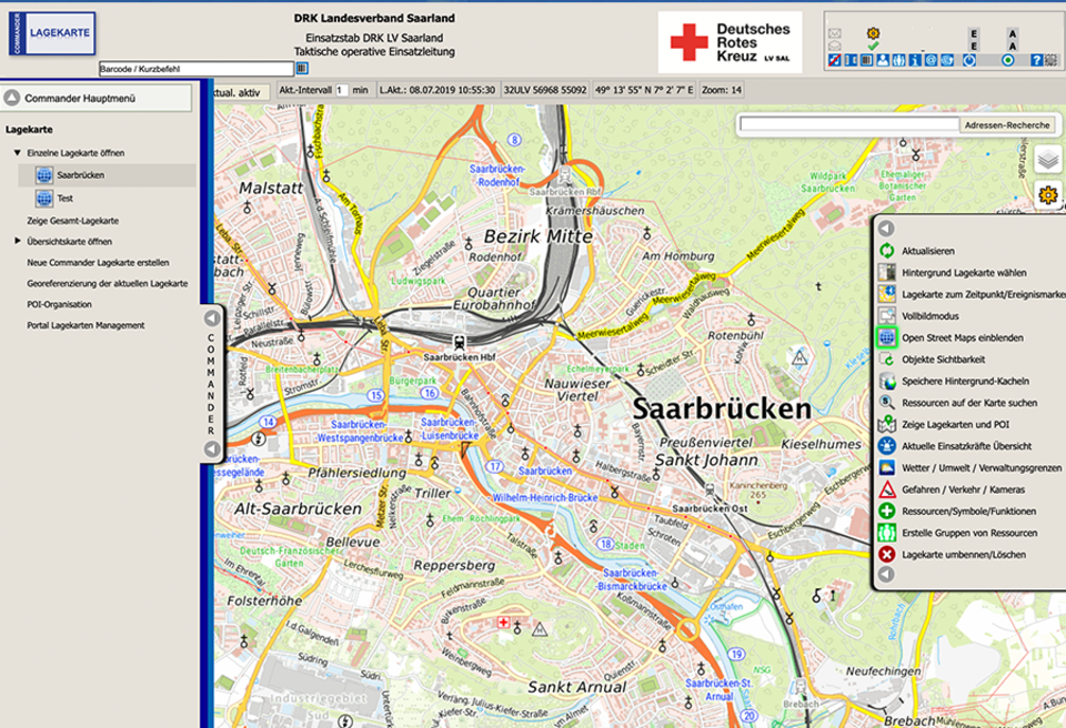 Lagekartenmodul zur Bearbeitung und Darstellung der Lage auf Grundlage von Open Street Maps, eigenen Grafiken, Fotos, Plänen, Einspielungen von Darstellungsdaten, Lagefilmen, Volltextsuchfunktionen für Ressourcen, Texten und taktischen Zeichen.
