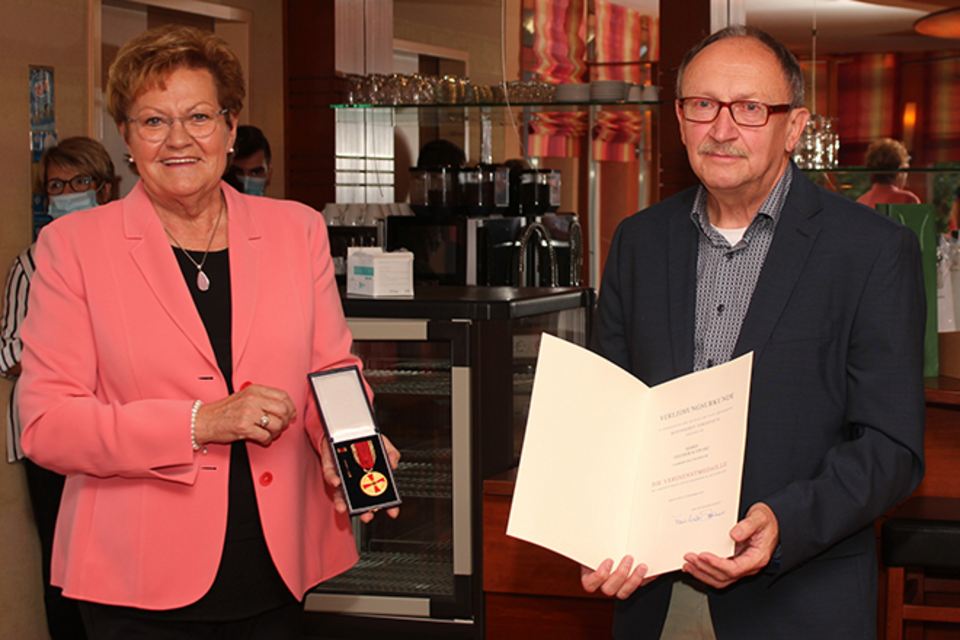 Der 63-jährige Theo Schwarz aus Namborn-Baltersweiler wurde im Café Henry der DRK-Seniorenresidenz Gersheim, seinem wie er es selbst bezeichnet „zweiten Wohnzimmer“, mit der Verdienstmedaille des Bundesverdienstordens der Bundesrepublik Deutschland ausgezeichnet. In der Feierstunde, der Corona bedingt lediglich 20 geladene Gäste, darunter auch dessen Ehefrau Martina beiwohnen konnten, überreichte ihm die saarländische Ministerin für Soziales, Gesundheit, Frauen und Familie, Monika Bachmann Verleihungsurkunde und die Ordensinsignien im Auftrag des Bundespräsidenten Frank-Walter Steinmeiner.