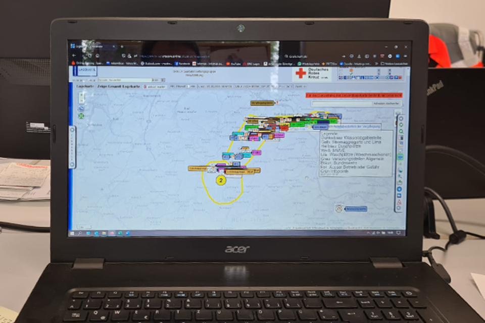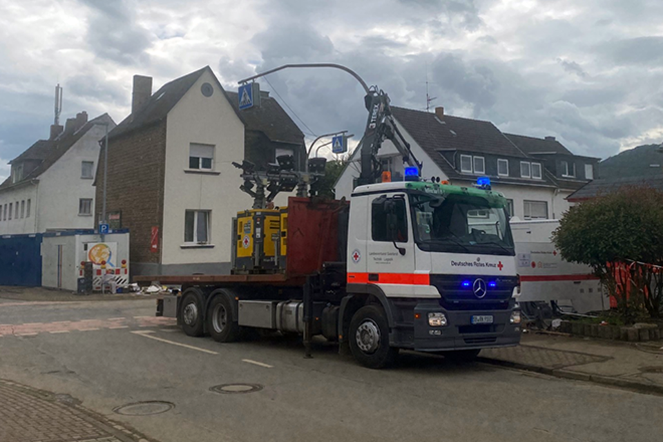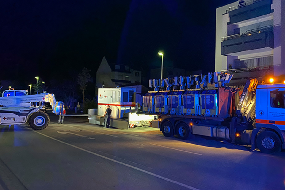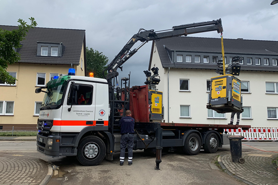 Denn nicht nur in Kalenborn und den Bereitstellungsräumen in Grafschaft und am Nürburgring (wir berichteten am 19.07.2021) waren wir mit Personal und Material unterstützend im Einsatz: Auch im Bereitstellungsraum Koblenz sind vier weitere Einsatzkräfte aus dem Saarland zur personellen, organisatorischen, technischen und logistischen Unterstützung sowie Führung der Bundesvorhaltungseinheiten im Bereich Logistik und Energie tätig. Hier werden unter anderem Stromerzeuger, Beleuchtungsanlagen und Betriebsstoffe koordiniert und dorthin gebracht, wo sie vor Ort dringend gebraucht werden. Dirk Schmidt, Landesbereitschaftsleiter des DRK-Landesverband Saarland e.V., ergänzt: „Hier hat sich auch das Wechselladerfahrzeug mit Kran des DRK-Landesverbandes mehrfach als ideales Einsatzmittel in der Lage bewiesen.“ Eine Einsatzkraft unterstützt das Führungs- und Lagezentrum im Bereich S2, der für die Feststellung, Darstellung, Information und Dokumentation des Einsatzes zuständig ist, in der Anwendung der Stabssoftware „CrisCom Commander“ die wir als Landesverband für diesen Einsatz bereitstellen. Tag und Nacht werden Stromerzeuger und Lichtanlagen in Betrieb genommen oder bedarfsorientiert umgesetzt. Auf Störungen muss sofort reagiert werden. Wasserausgabestellen waren und sind zu verteilen. Aktuell wird eine mobile Kläranlage des DRK in Betrieb genommen. Sie ist ein Prototyp und soll helfen, die vorhandenen Abwasserprobleme zu lösen.