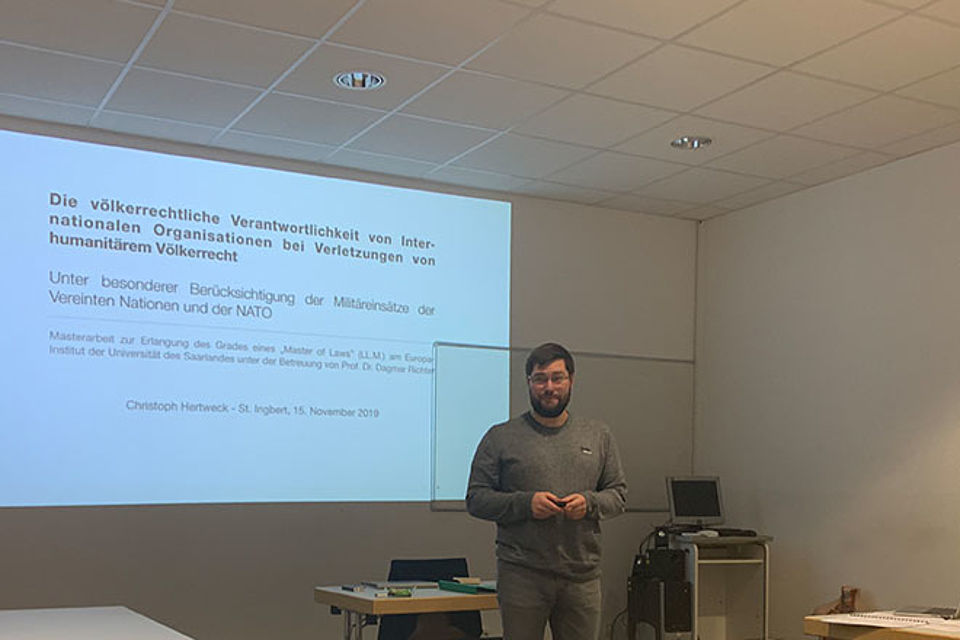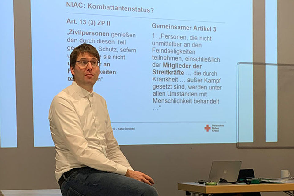 Im Anschluss referierte der diesjährige Stipendiat des DRK-Landesverbandes Christoph Hertweck zur völkerrechtlichen Verantwortlichkeit von Internationalen Organisationen bei Verletzungen des humanitären Völkerrechts. Dabei wurden die vorher vermittelten Grundsätze unter besonderer Berücksichtigung des Militäreinsätze der Vereinten Nationen und der NATO präzisiert und in einen greifbareren Bezug gesetzt.