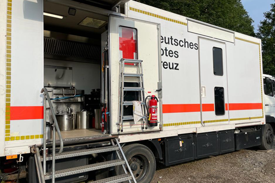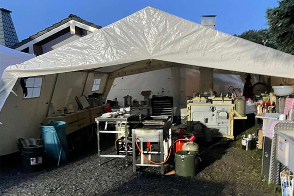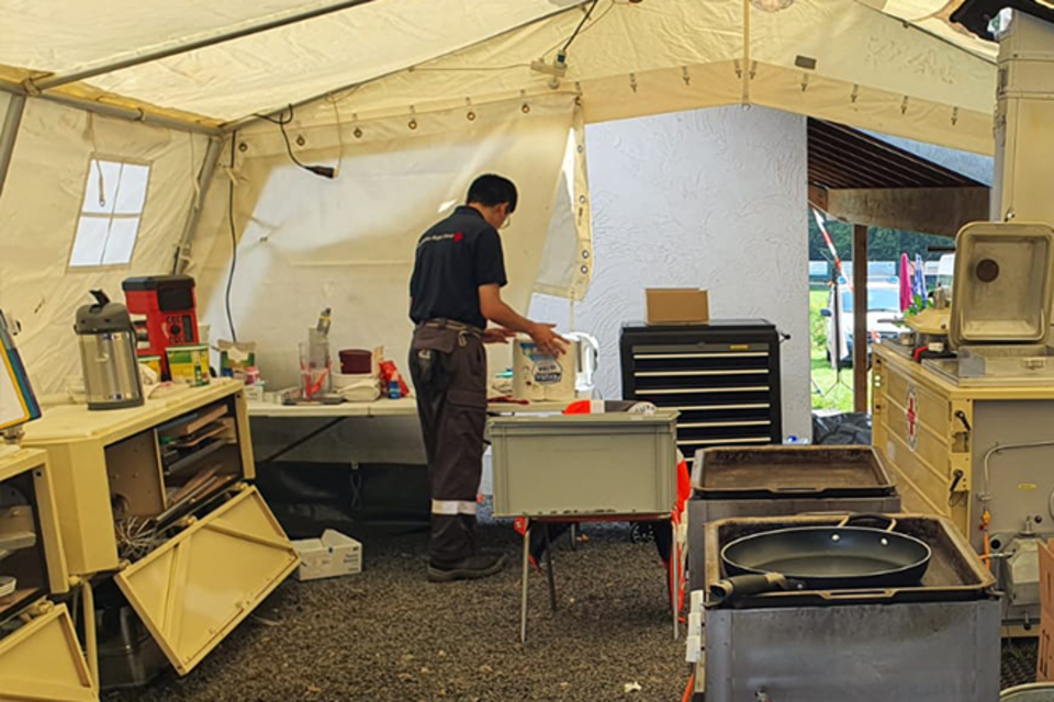 Unsere Verpflegungs- und Betreuungseinheiten sorgen unter anderem dafür, dass Betroffenen und den Einsatzkräften zu jeder Tageszeit Getränke und Mahlzeiten angeboten werden können. Die Feldküchen der DRK-Kreisverbände Saarbrücken, Saarlouis und St. Wendel bereiten in Altenahr täglich zwischen 1000 und 1500 Portionen Warm- und bis zu 2500 Portionen Kaltverpflegung zu.