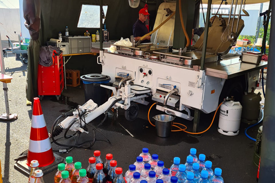 Seit Dienstag, 20.07.2921 werden die Einsatzkräfte vor Ort, aufgrund eines immer höher werdenden Bedarfs von Verpflegung für Betroffene und Kräfte der Hilfsorganisationen, zusätzlich durch eine weitere Küche und eine Betreuungsgruppe aus dem DRK-Kreisverband Saarlouis unterstützt.