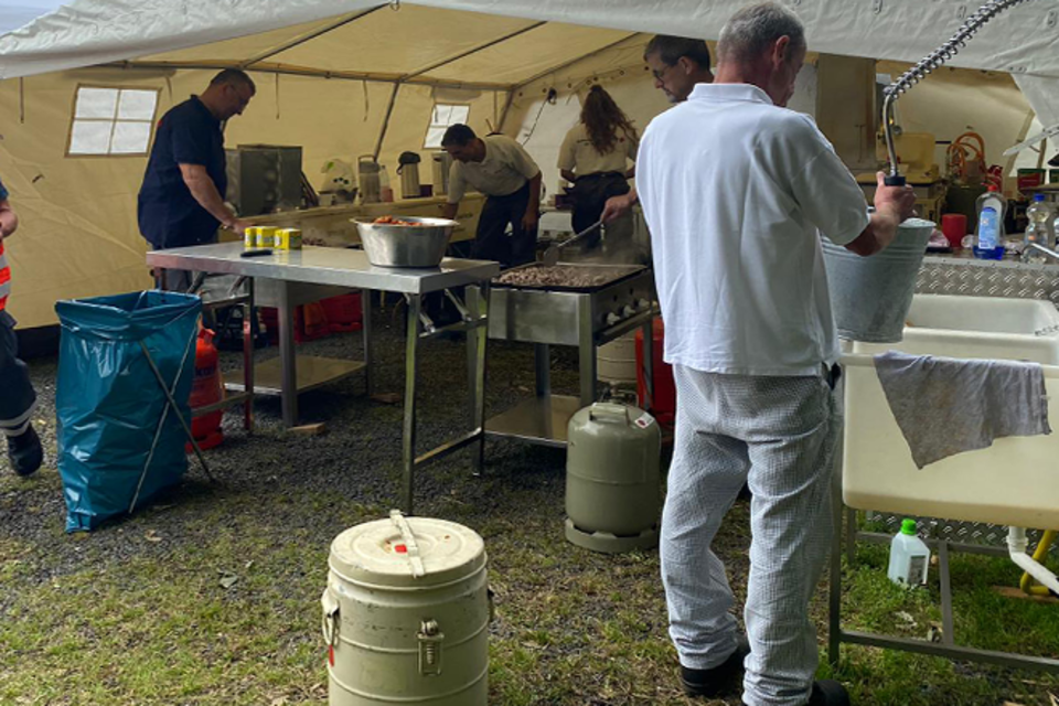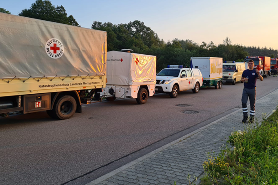 Das Rote Kreuz ist hier im Dauereinsatz – die Verpflegung vor Ort übernimmt unter anderem seit Sonntag eine Einheit unter Führung des DRK-Kreisverbandes Saarlouis e.V., bestehend aus den DRK-Ortsvereinen Aschbach, Gresaubach, Hüttersdorf und Steinbach. Diese wird seit Montag durch eine Verpflegungsgruppe des Ortsvereins Püttlingen aus dem DRK-Kreisverband Saarbrücken e.V. unterstützt.