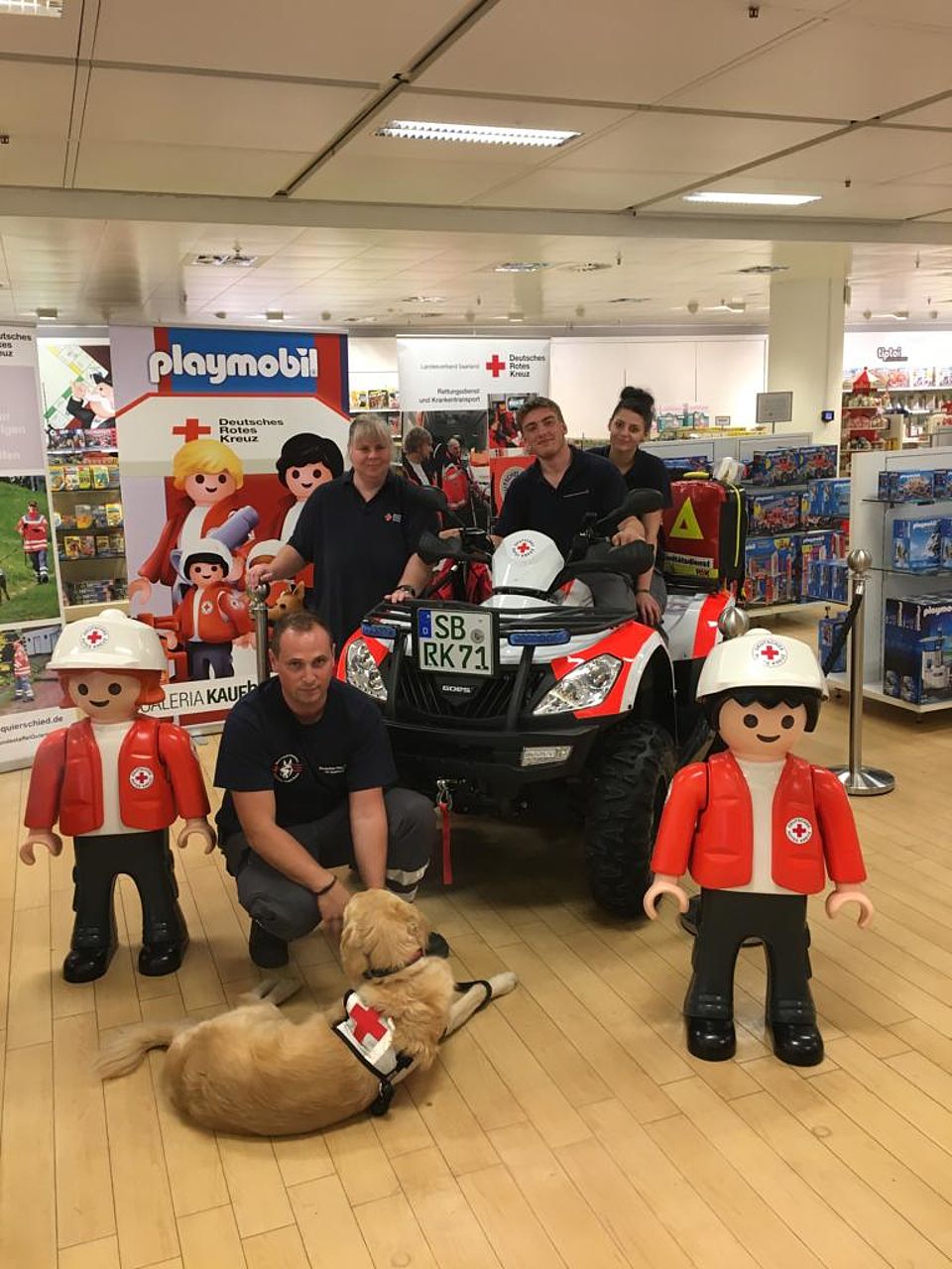 Hier können die neuen Spielwaren auch bestaunt werden. Wer noch nicht größer als 1,5 m ist, kann sogar den DRK-Figuren direkt in die Augen schauen, denn auch Großfiguren sind aufgestellt. Noch größer sind die echten DRK-Helfer aus unseren Kreisverbänden, die an den Aktionstagen ihre Arbeit vorstellen und gerne Fragen beantworten. Neben den Großfiguren ist unser ATV (all terrain vehicle, siehe Foto) ausgestellt. Dieses neue Fahrzeug ermöglicht es uns eine patientengerechte und schonende Rettungs aus unwegsamem Gelände durchzuführen. Wir freuen uns, wenn Sie vorbeischauen möchten.