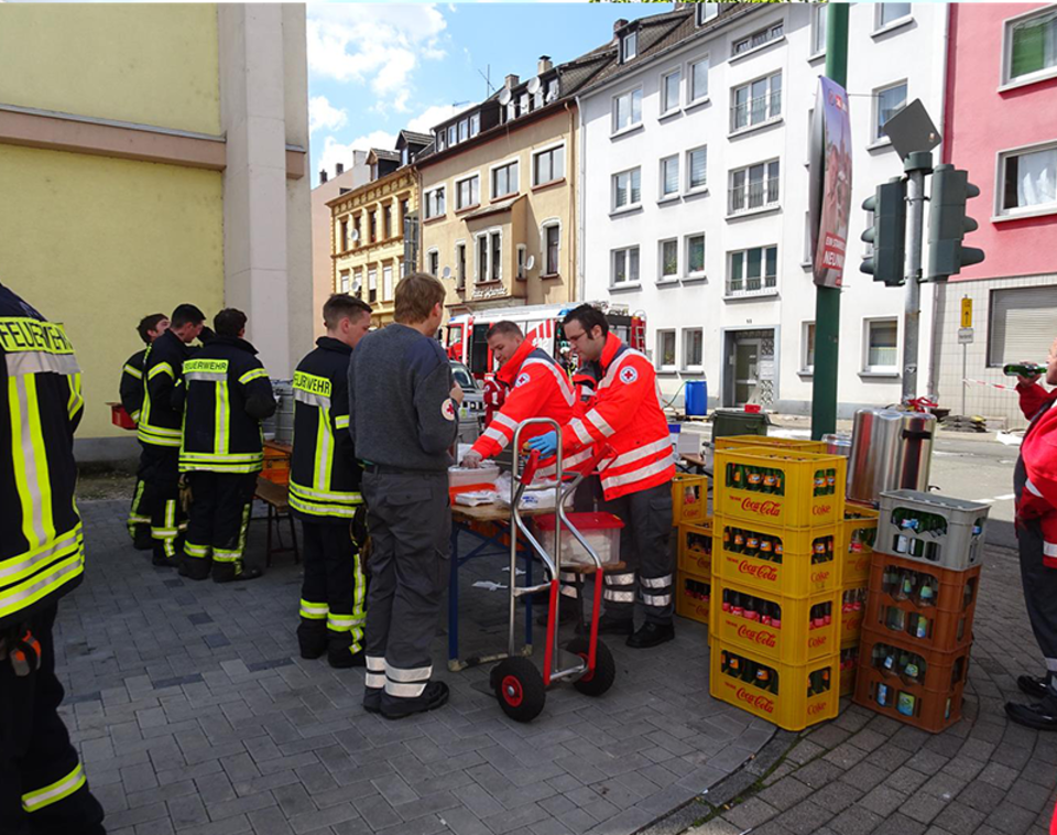 Von den frühen Morgenstunden bis in den späten Abend wurden die Einsatzkräfte am Sonntag vom DRK OV Wiebelskirchen mit Essen und Getränken versorgt. Dafür wurden u.a. 60-70 Portionen Erbsensuppe, 16 Ringe Lyoner, 500 Brötchen, 14 kg warmer Fleischkäse, 3 kg kalter Fleischkäse und Erbsensuppe herangeschafft und etwa 120 l Kaffee und Tee gekocht. Weil Sonntag und gleichzeitig auch Muttertag war, war dies nicht immer ganz einfach. Ein ausdrücklicher Dank geht daher auch an alle Firmen, die spontan und sofort bereit waren, Kalt- und Heißwaren zur Verfügung zu liefern.