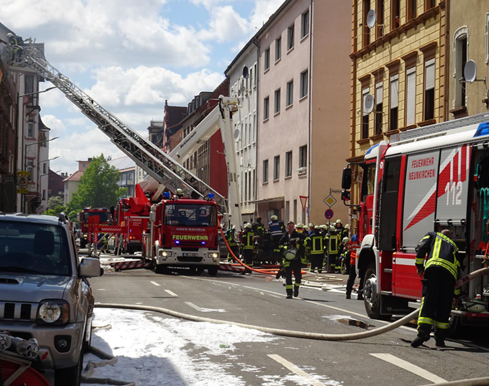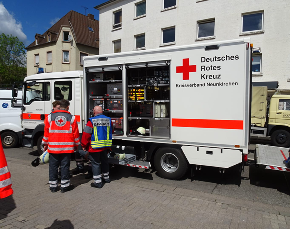 Die Schnelleinsatzgruppe (SEG) des DRK Kreisverbandes Neunkirchen wurde von der Integrierten Leitstelle Saar am frühen Sonntagmorgen zur Unterstützung des Rettungsdienstes alarmiert. Ab ca. 6.00 Uhr war sie bis in die späten Abendstunden zeitweise mit bis zu 42 Helferinnen und Helfern der DRK Ortsvereine Wiebelskirchen, Landsweiler, Merchweiler, Stennweiler und Eppelborn, dem Gerätewagen-Sanitätsdienst (GWSan) aus Merchweiler, den Rettungswagen (RTW) aus Illingen, Furpach und Wustweiler vor Ort. Der DRK OV Neunkirchen stand mit seiner Kleiderkammer bereit für hilfebedürftige Betroffene. Anfangs waren bis zu ihrem Einsatzabbruch durch den Rettungsdienst auch der GWRett, Teile der SEG und der Führer vom Dienst aus Homburg an der Unglücksstelle.