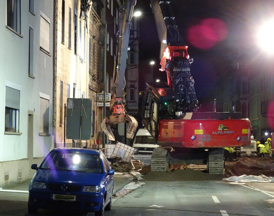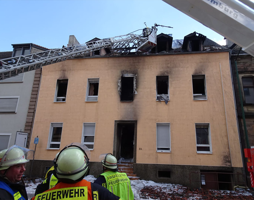 Die Löscharbeiten an und in dem stark brandgeschädigten Haus gestalteten sich sehr schwierig und zogen sich über fast drei Tage hin. Für die Löscharbeiten musste die Knickdrehleiter der Bosch-Berufsfeuerwehr Homburg sowie zur Schaffung eines Zugangs in das Gebäude ein schwerer Langstielbagger eingesetzt werden.